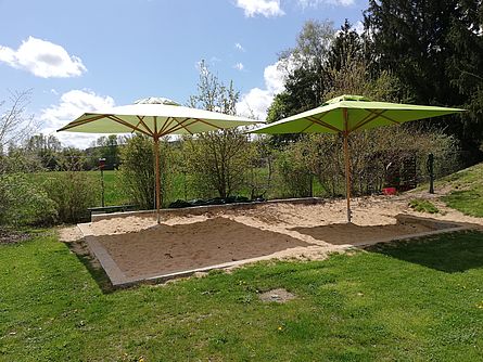 Die Königinnenschaukel, der Seilgarten, ein Fußballplatz, ein Basketballkorb, eine Rutsche, ein großer Sandkasten mit Wasserpumpe, ein Bodentrampolin und eine Kletterwand laden zum Bewegen, Spielen, Toben und Hüpfen ein. Auf unserer Terrasse fahren die Kinder gerne Inliner und Roller, springen Seil oder malen mit Straßenkreide.