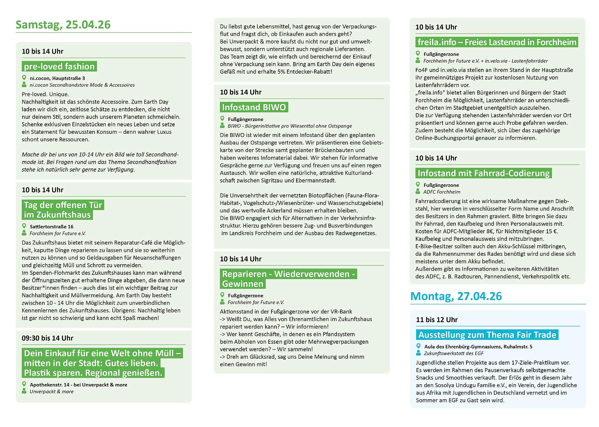 An den Aktionsständen in der Fußgängerzone, gestaltet von Forchheim for Future, in.velo.via, BIWO und dem ADFC, informieren die Initiativen über den Schutz von Natur- und Kulturlandschaften, bessere ÖPNV-Verbindungen, den Ausbau des Radwegenetzes sowie über Pfandsysteme für das Mitnehmen von Speisen. Außerdem werden die Lastenräder von freila.info vorgestellt und können direkt ausprobiert werden. Am ADFC-Stand ist zudem eine Fahrradcodierung zum Schutz vor Diebstahl möglich. Beim Glücksrad von Forchheim for Future können Besucherinnen und Besucher außerdem ihr Glück versuchen.