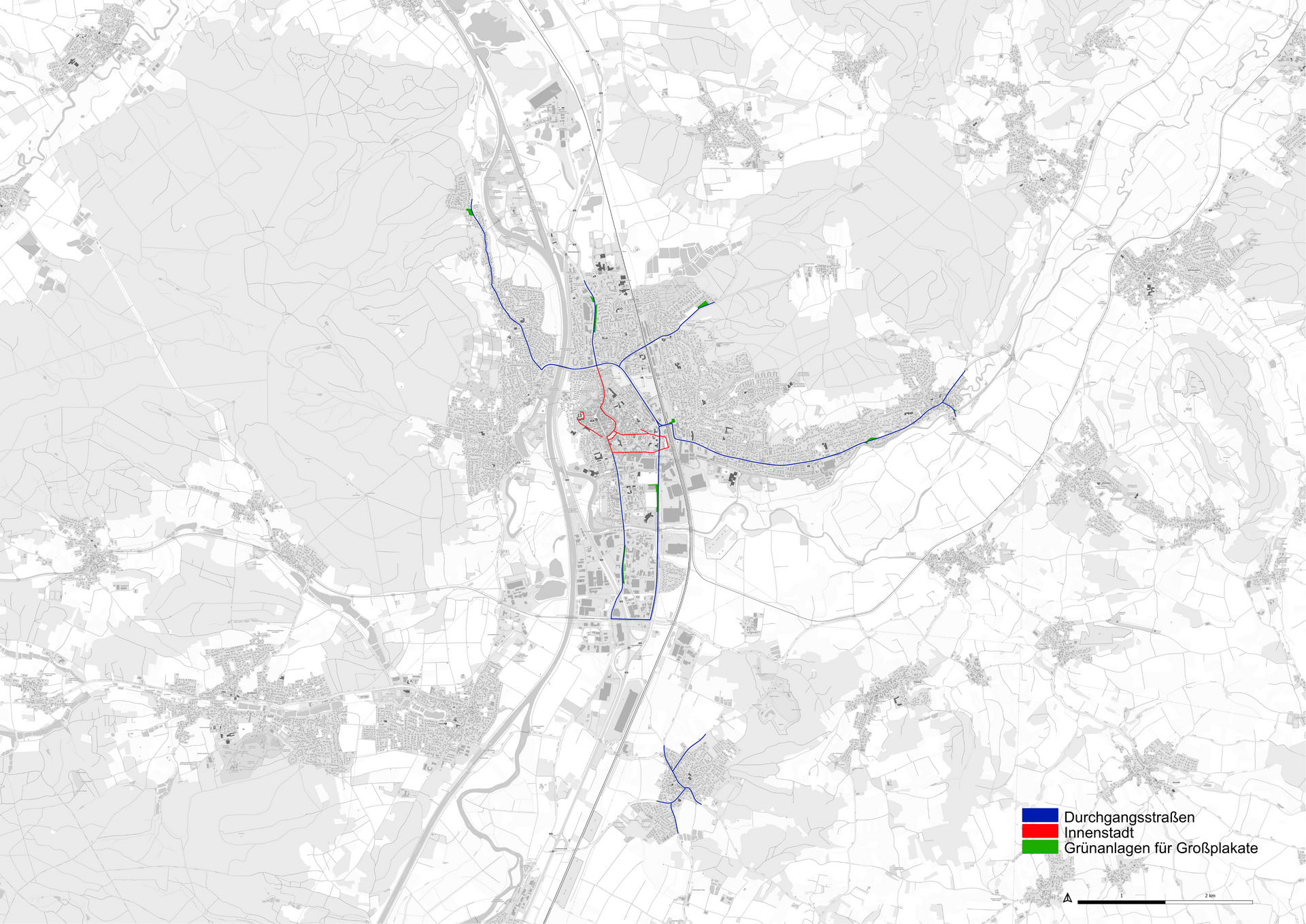 Das Ortsschild begrenzt das Stadtgebiet, darüber hinaus dürfen keine Plakate bzw. Großplakate aufgestellt oder angebracht werden. Hier ist es nicht relevant ob Plakate auf öffentlichen oder Privatgrund aufgestellt werden.